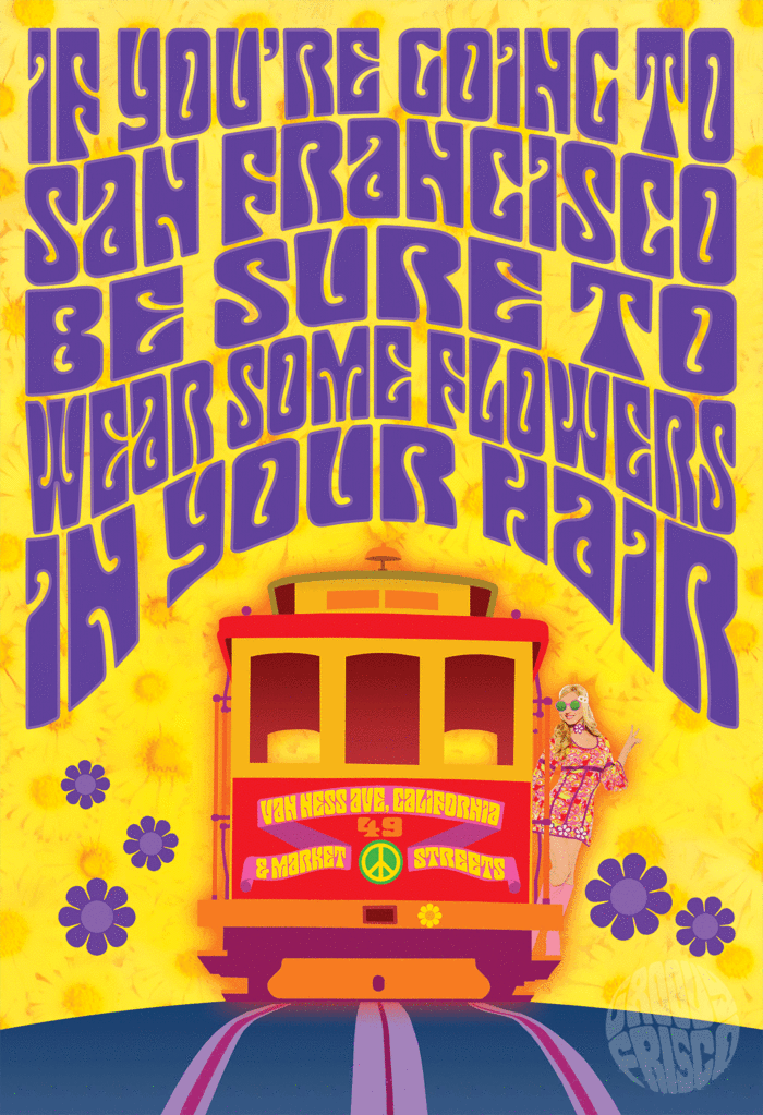 - Featuring groovy Flower Child riding Van Ness, California & Market Line Cable Car, "If you're going to San Francisco be sure to wear some flowers in your hair"